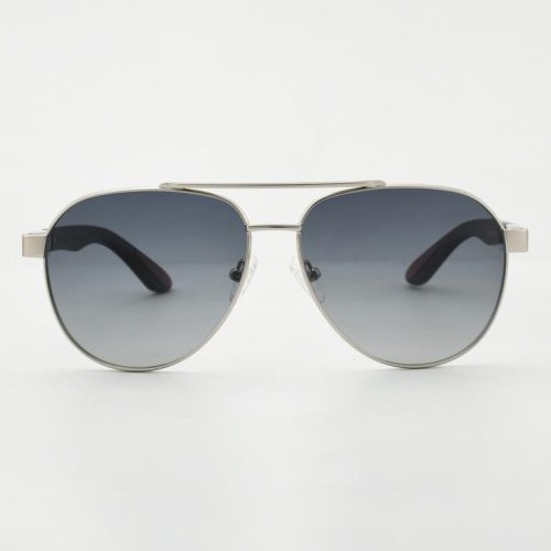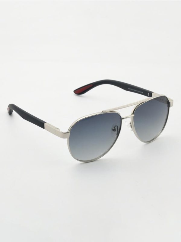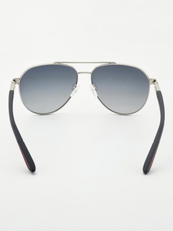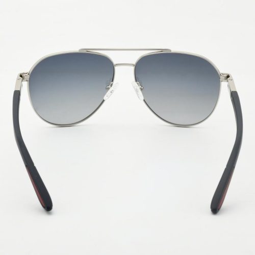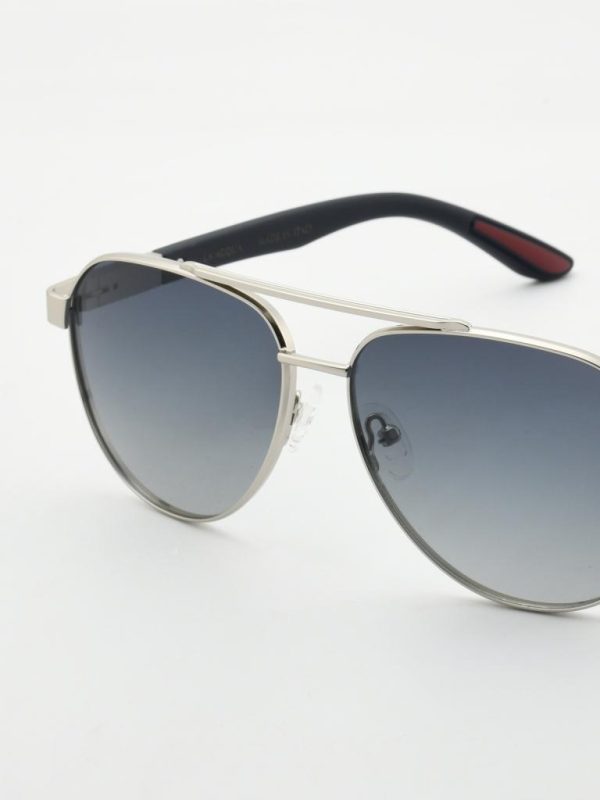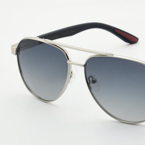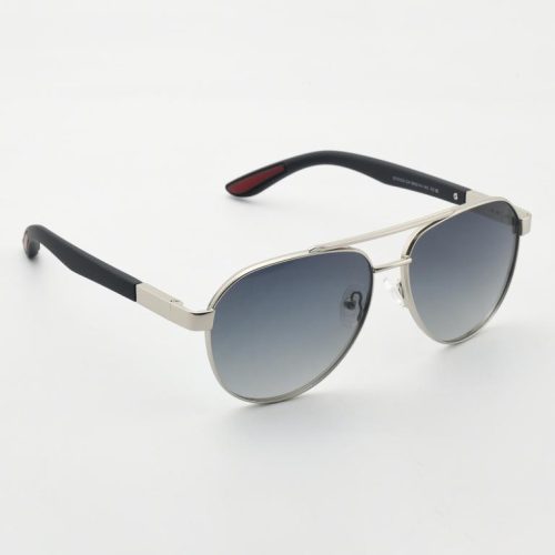 A refined aviator crafted in Italy with a slim satin-silver metal frame and gradient grey 1.1 mm polarized lenses for crisp, glare-free vision. Matte-black temples with subtle red detailing add a sporty, modern finish.