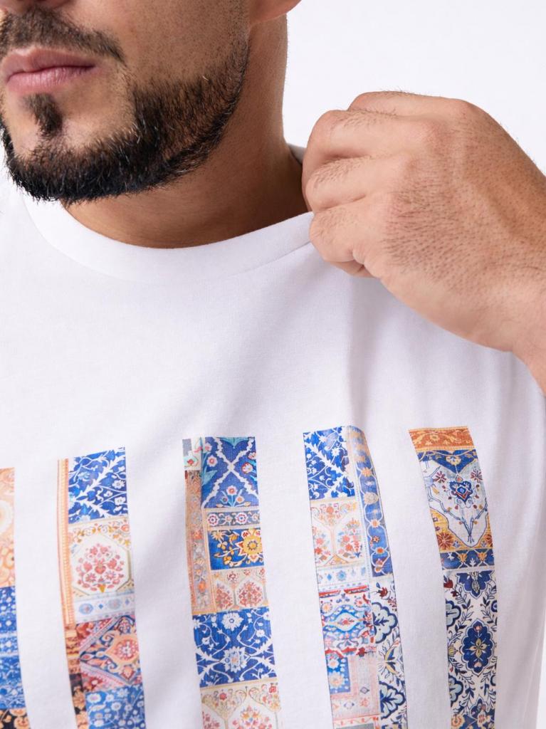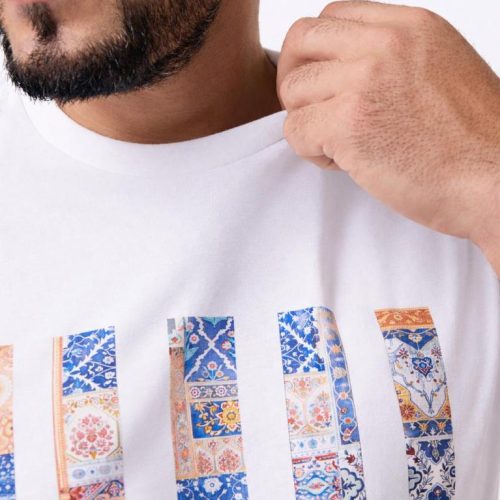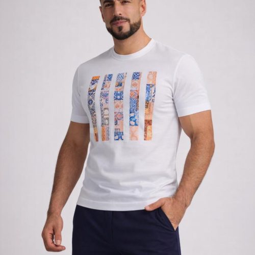 The front features an original graphic print inspired by Mediterranean tiles, combining warm earthy tones with deep blue accents in a clean vertical layout. The design adds character while keeping the look modern and easy to style.