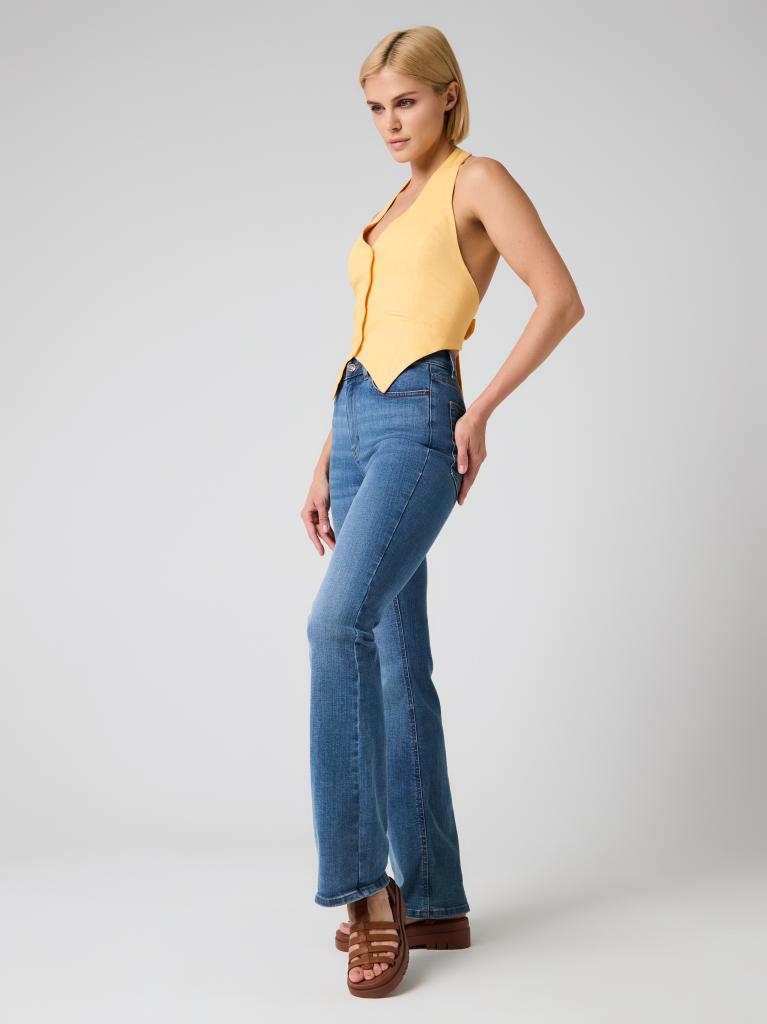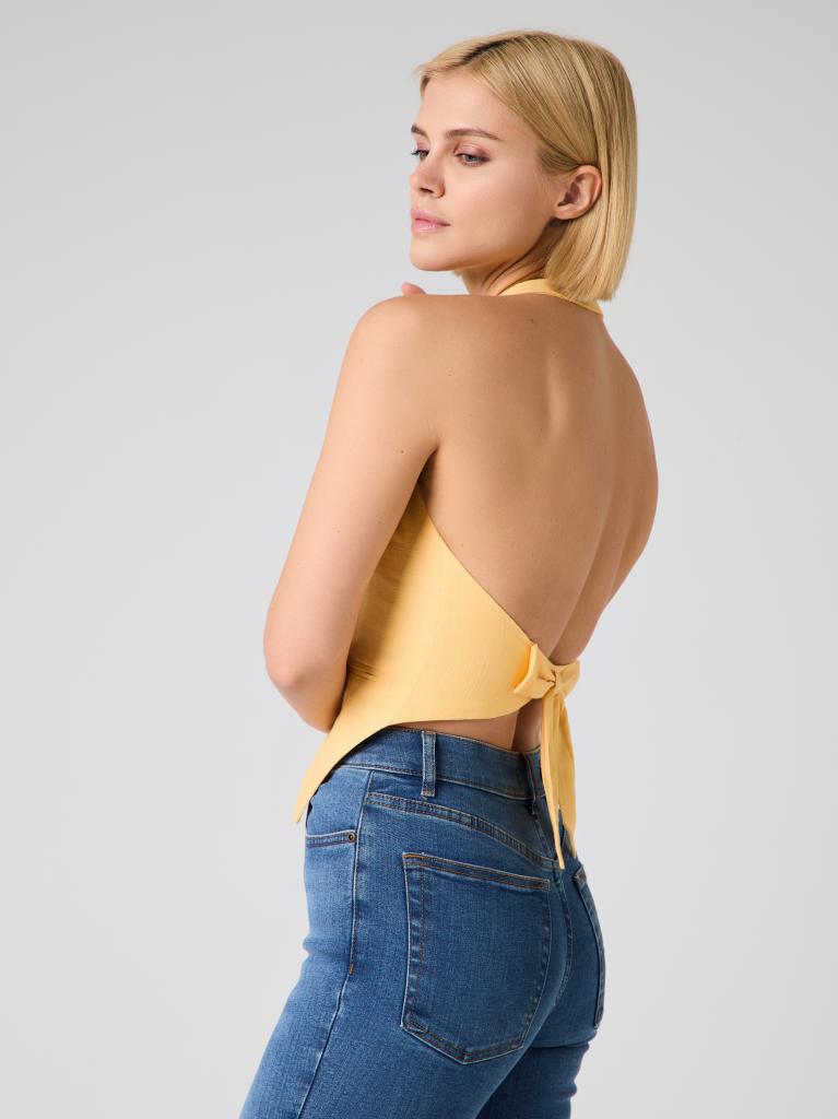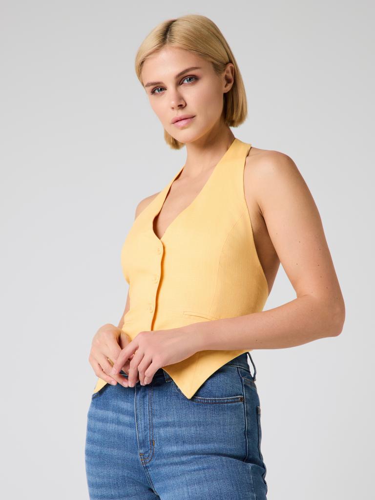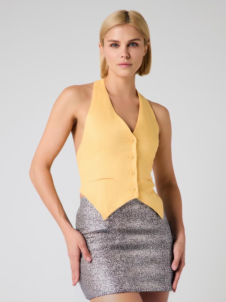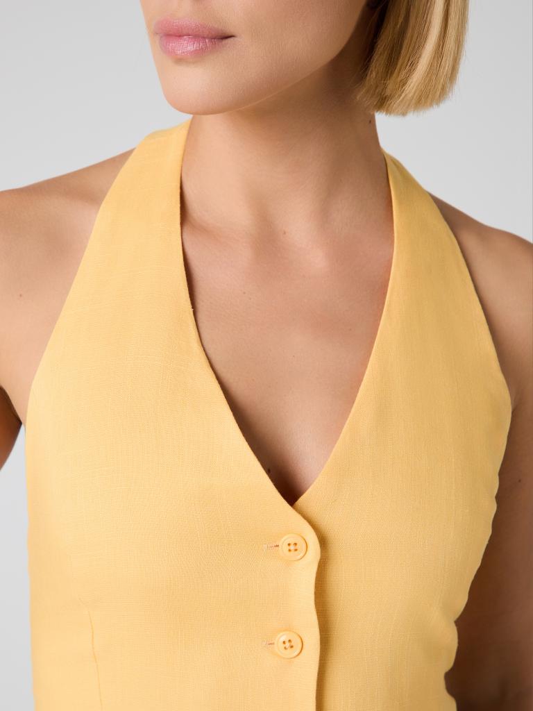 Chic and structured, this tailored vest is crafted from a breathable linen-blend fabric for a natural, polished look. Featuring a deep V-neckline, button front, and a flattering pointed hem, it brings modern elegance to any outfit. The open back with a bow tie detail adds a feminine twist. Made in Argentina, it’s perfect for layering or wearing solo on warmer days.