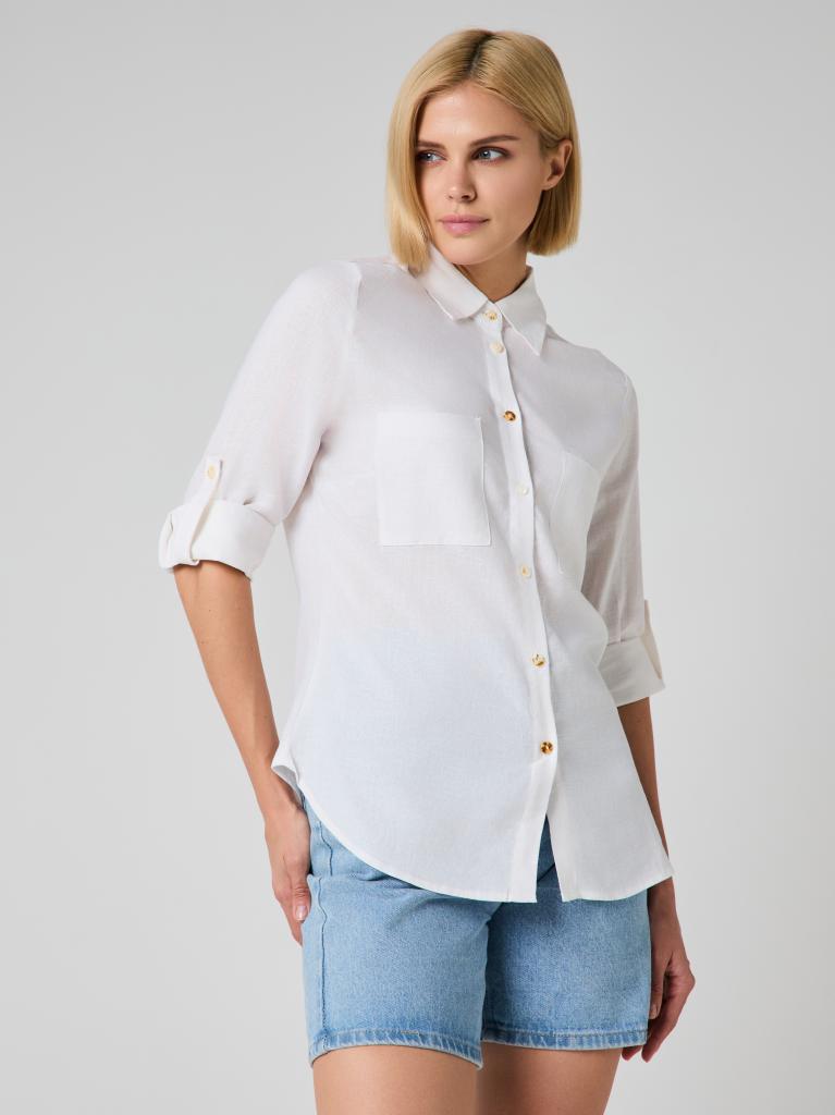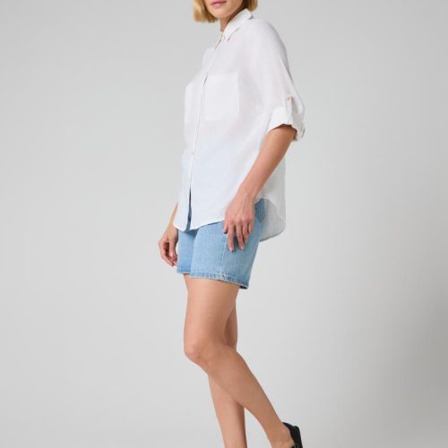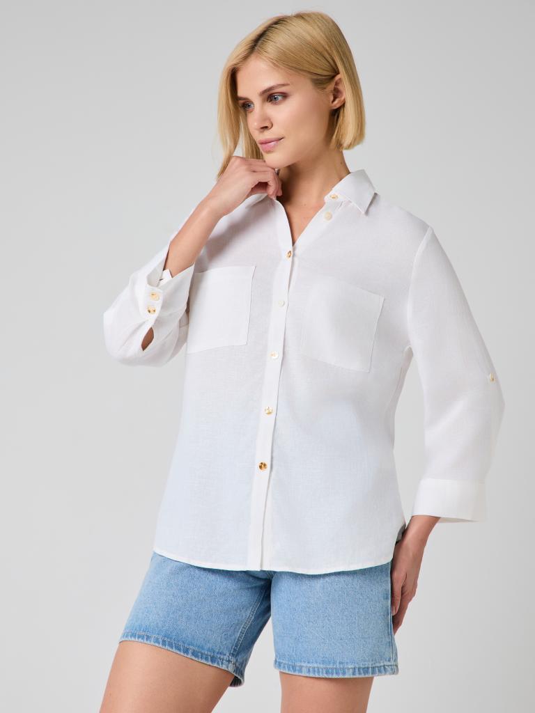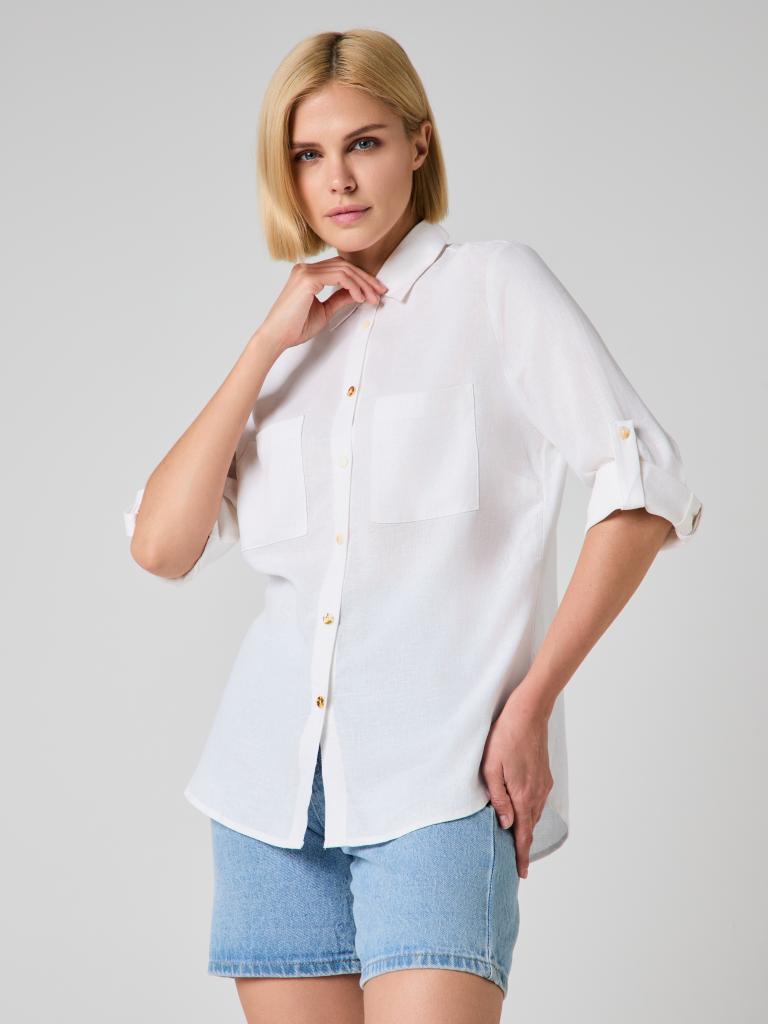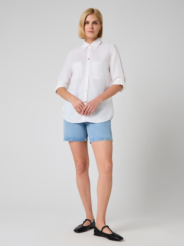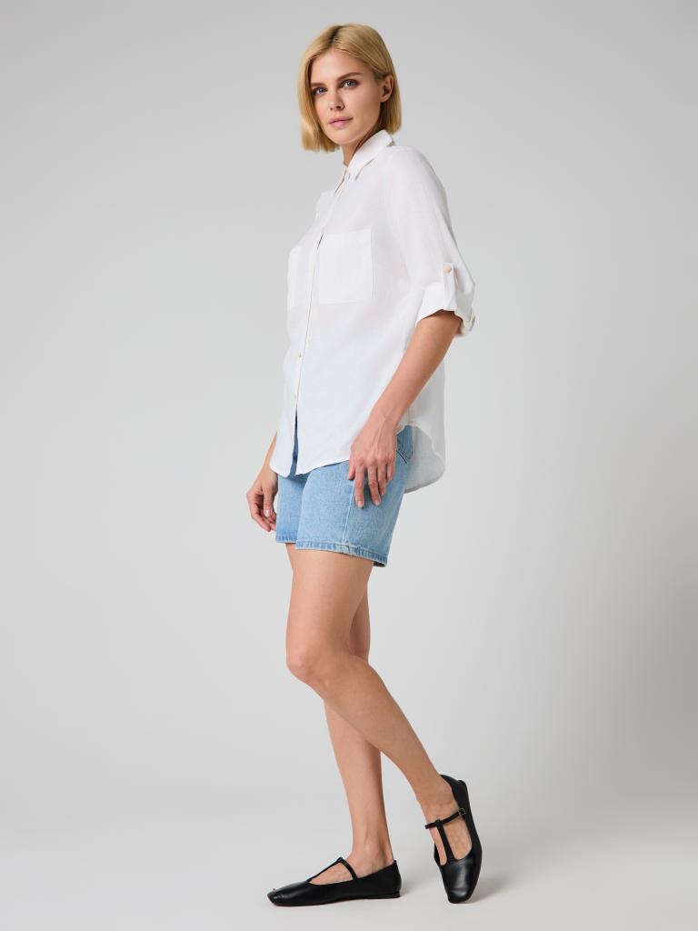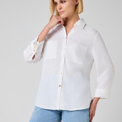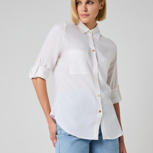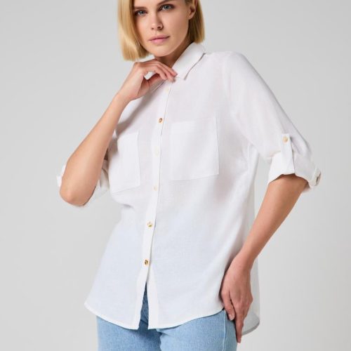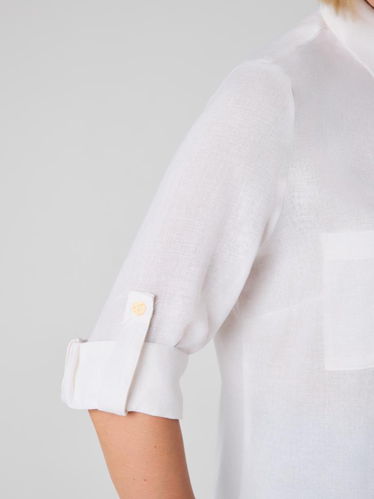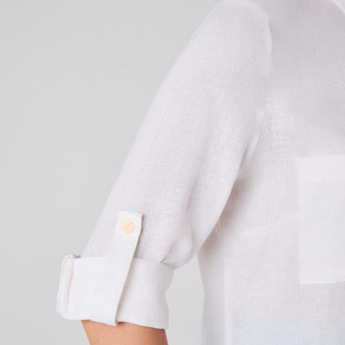 The relaxed silhouette is complemented by thoughtful details—two front patch pockets, a structured collar and subtle gold-tone buttons that add a delicate contrast to the soft off-white shade. Sleeves can be worn full length or rolled and secured with the button tab for a more laid-back look.