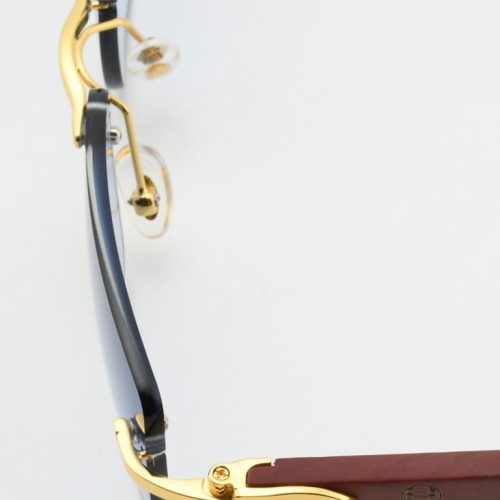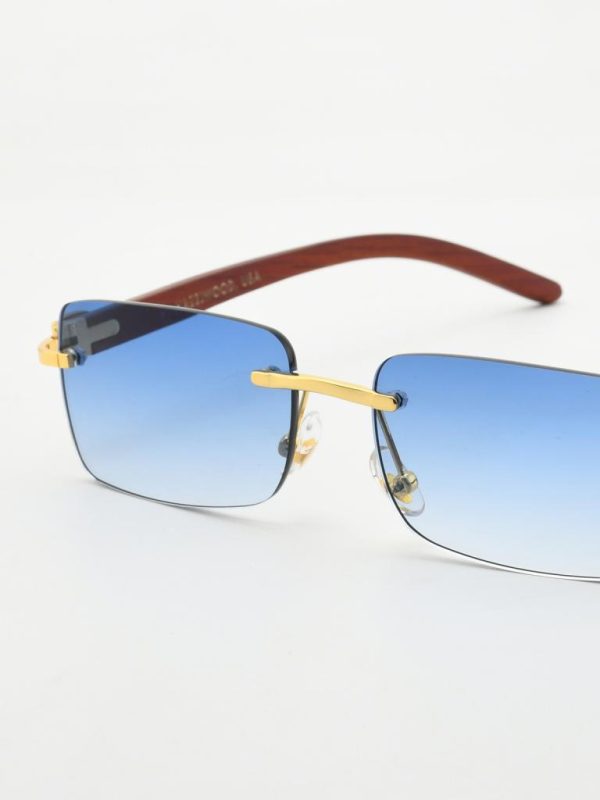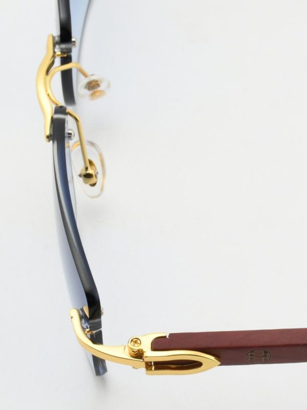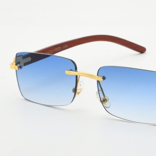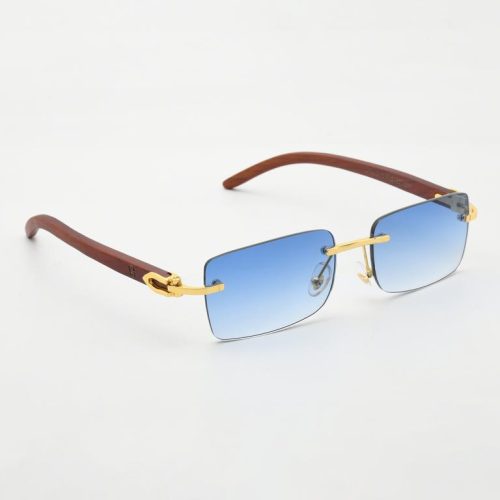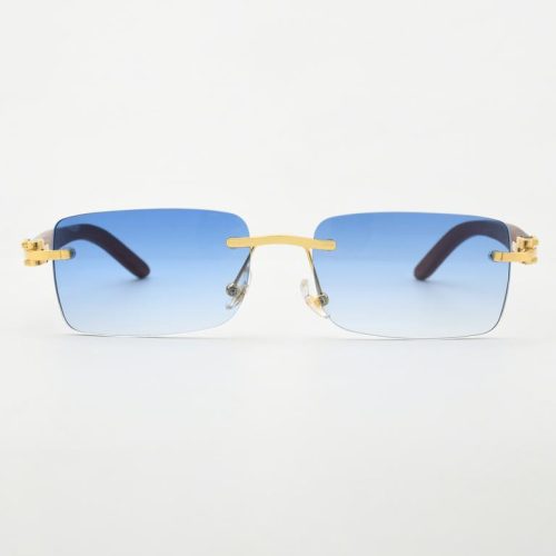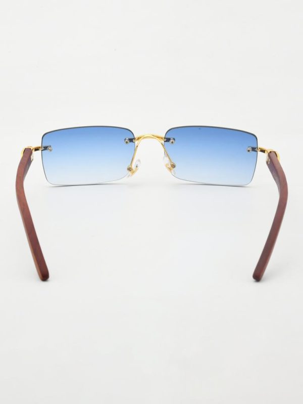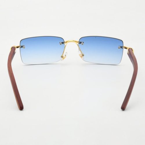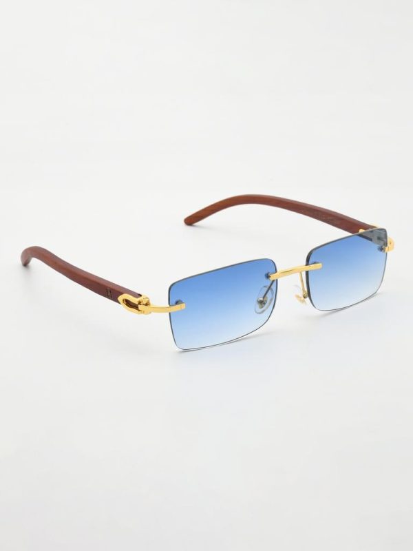 Airy and elegant: rimless rectangle lenses tinted in a cool blue gradient, paired with polished gold hardware and real rosewood temples. Lightweight, refined, and made for relaxed, glare-comfortable vision with full UV400 protection.