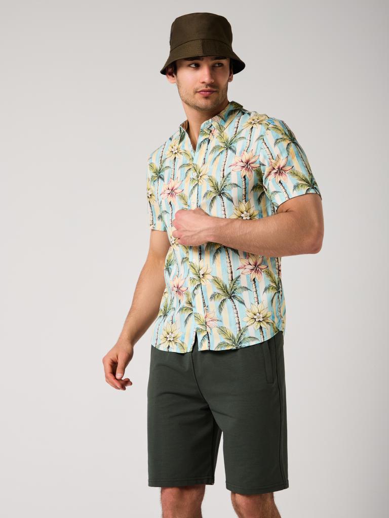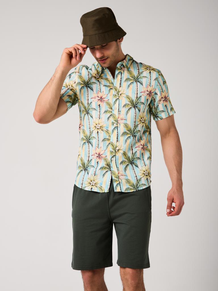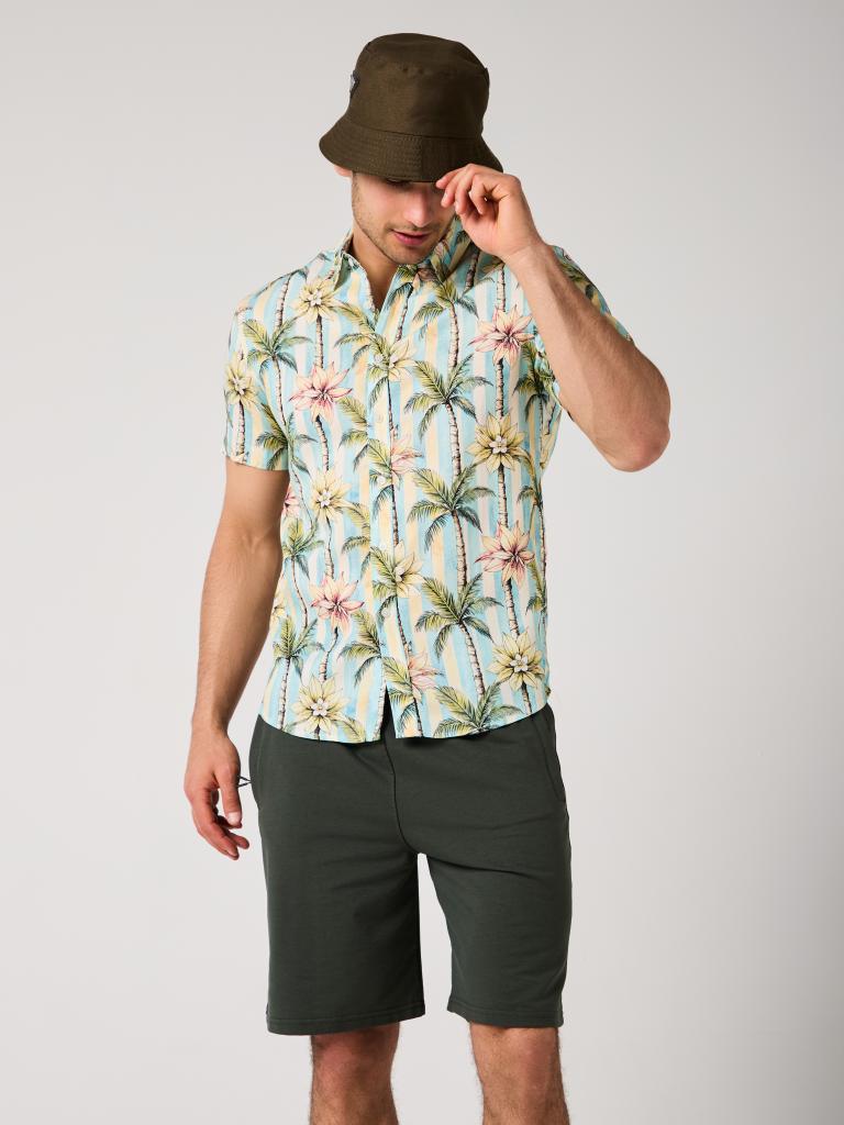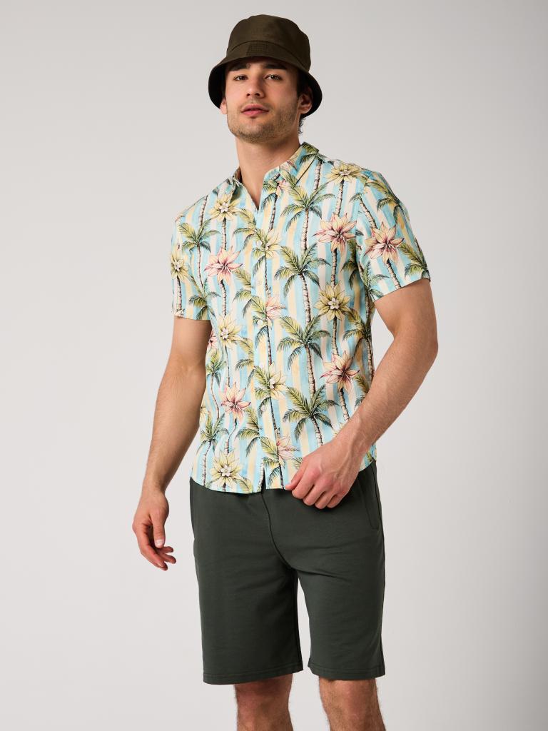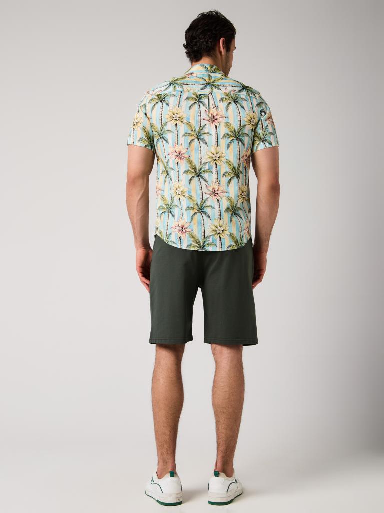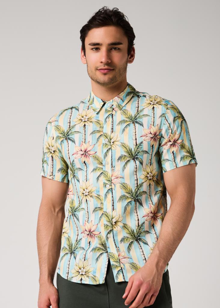 This tropical shirt, crafted from 100% luxury Tencel for an ultra-soft, breathable feel. The vibrant palm tree and floral print on a soft pastel striped background gives this shirt a fresh, summery look that stands out without trying too hard.