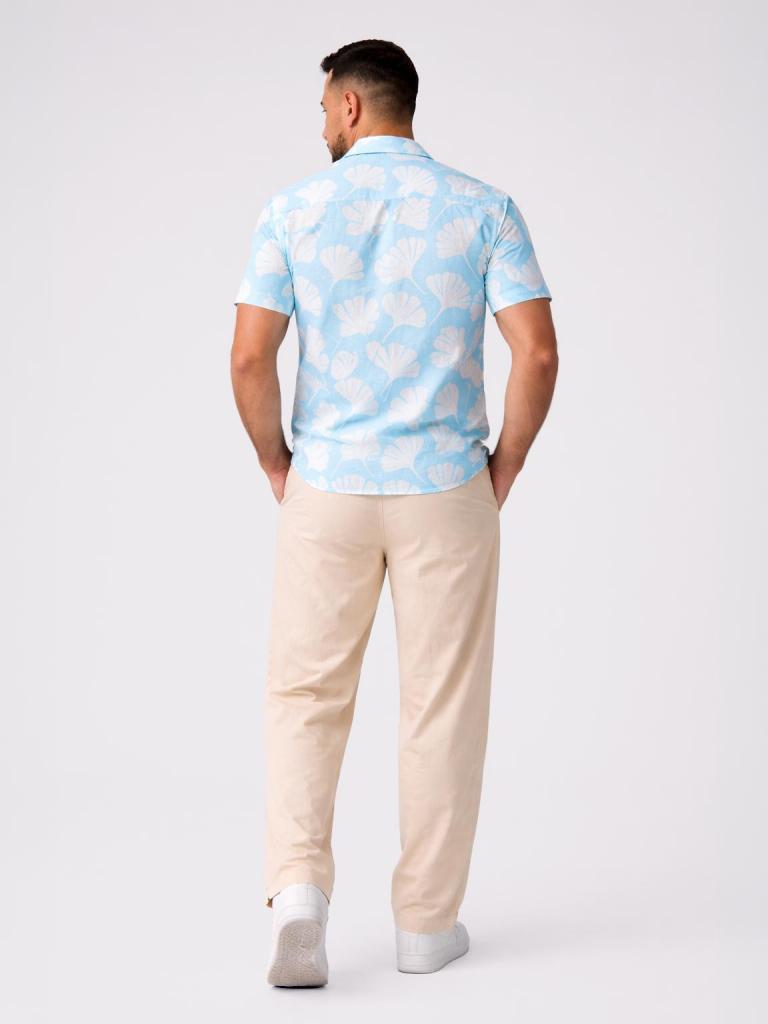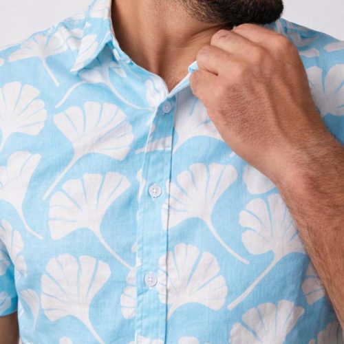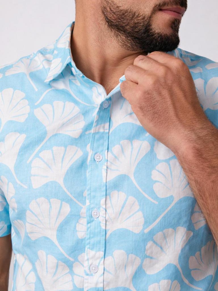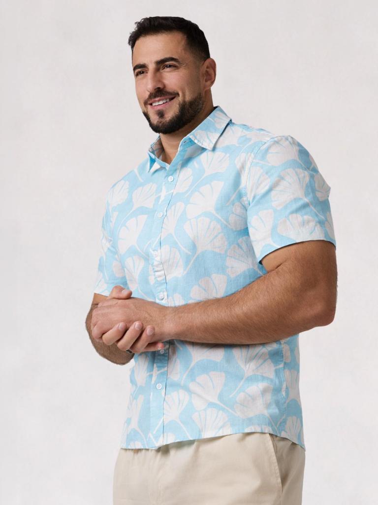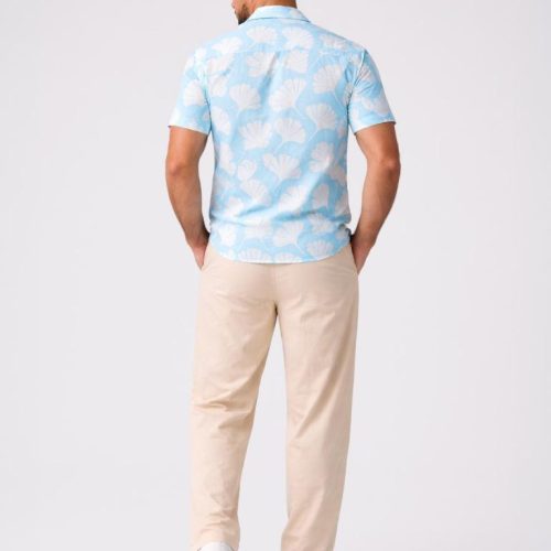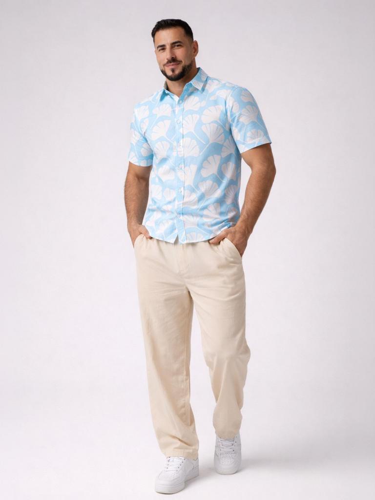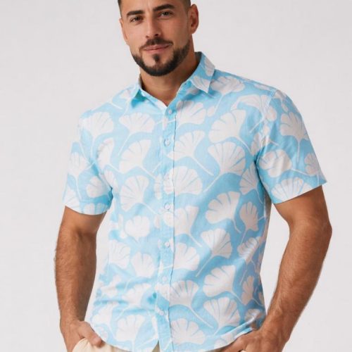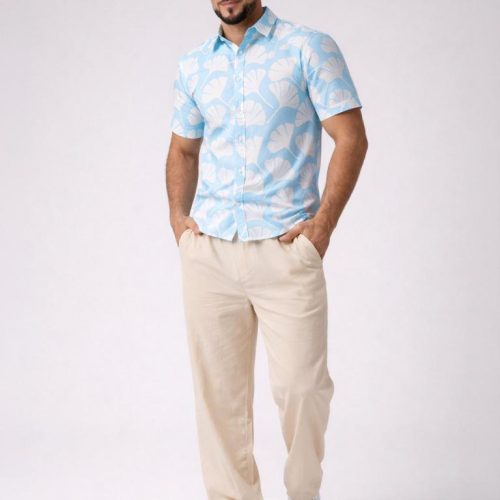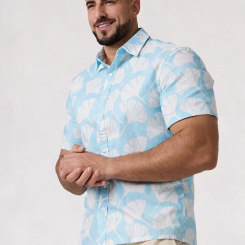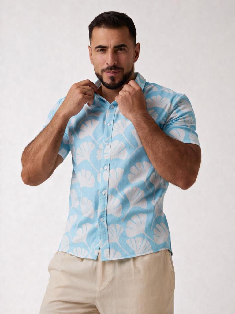 The light blue base with a white botanical print gives it a fresh, resort-inspired feel — easygoing yet refined. Designed with a classic collar and short sleeves, it offers a relaxed fit that works perfectly for holidays, weekends, or casual evenings.
