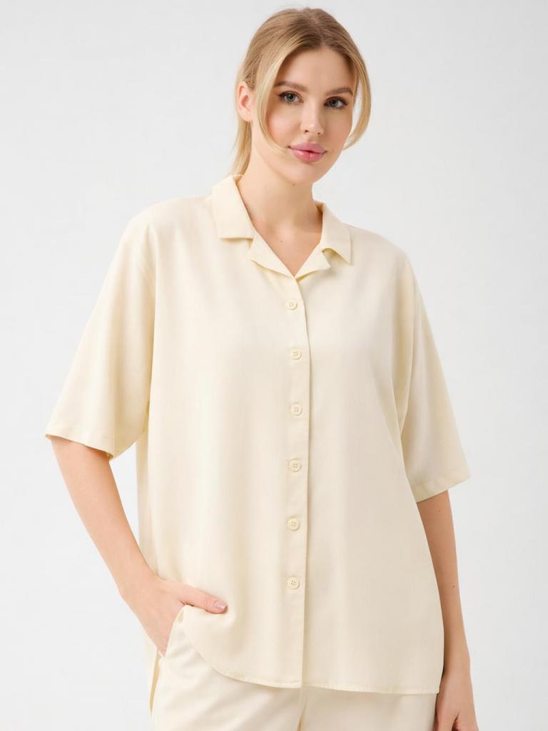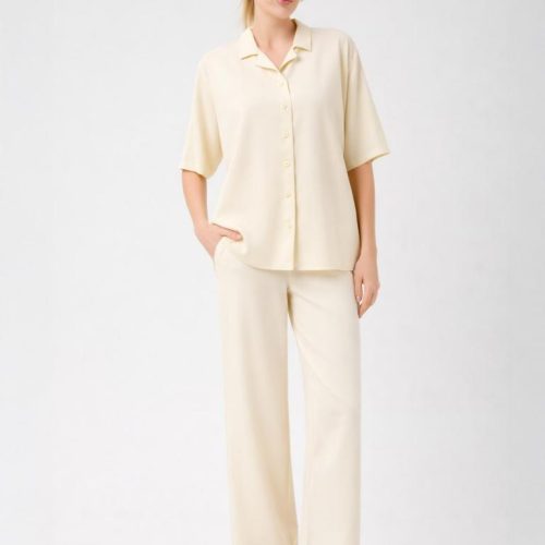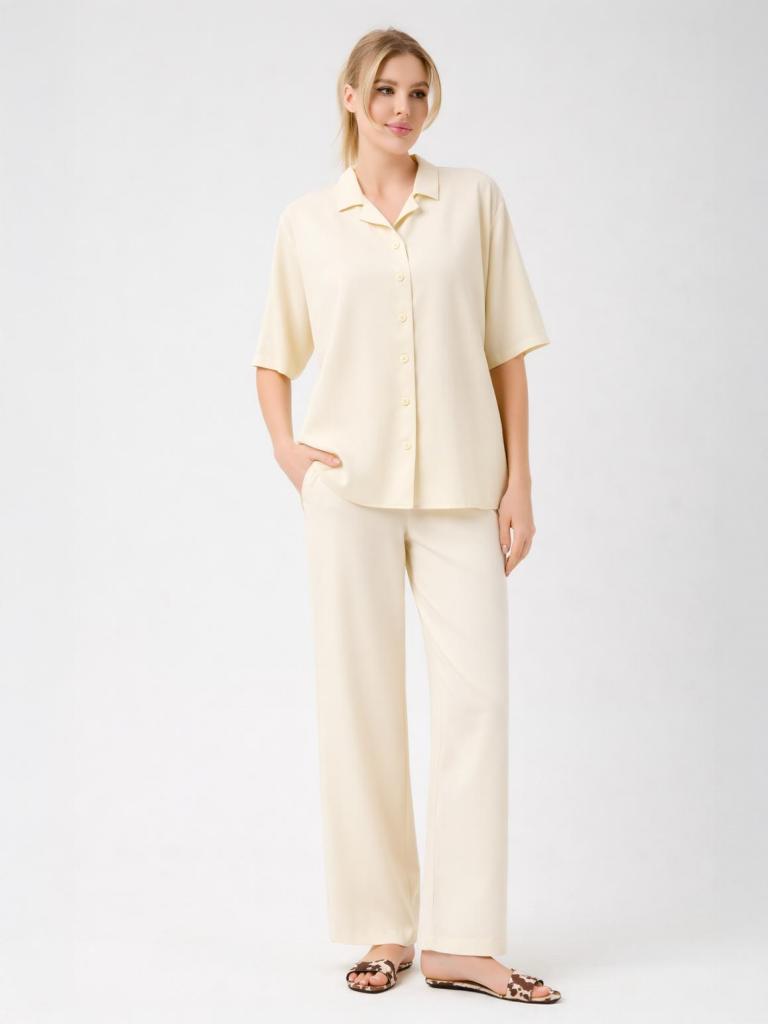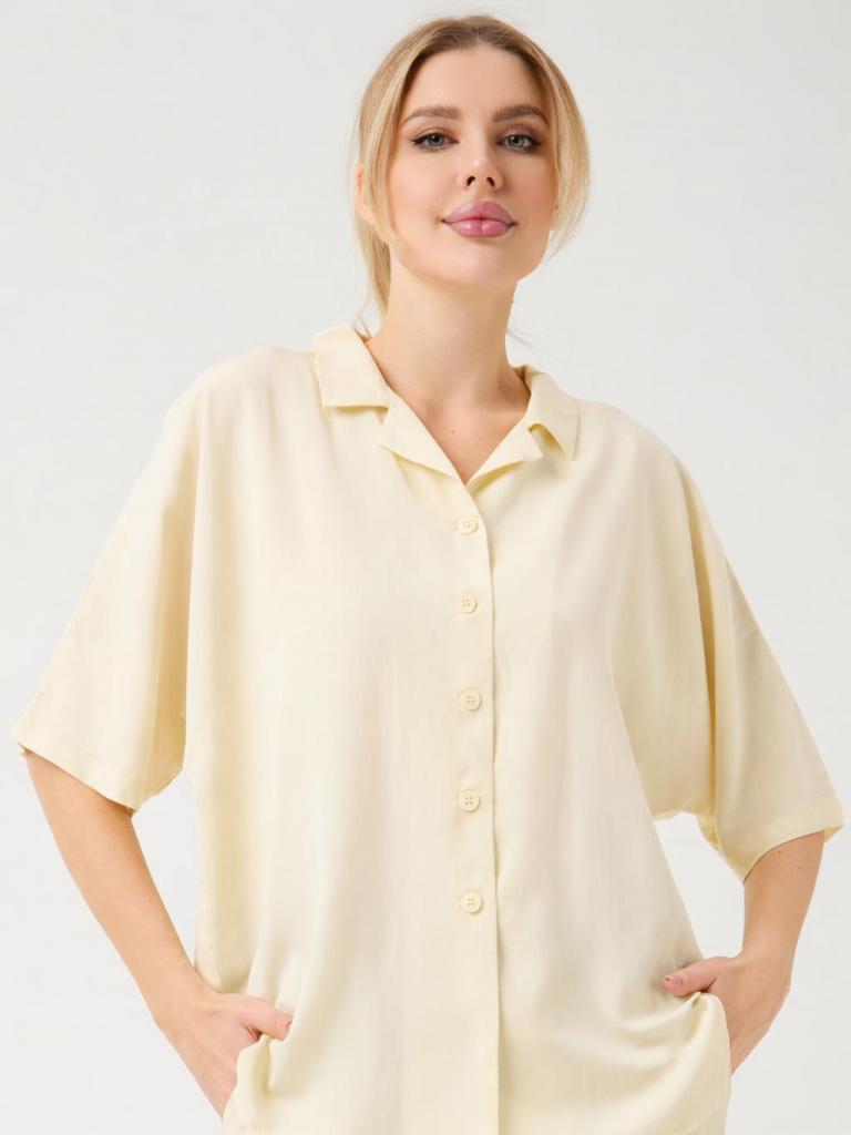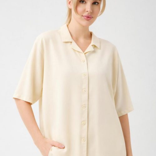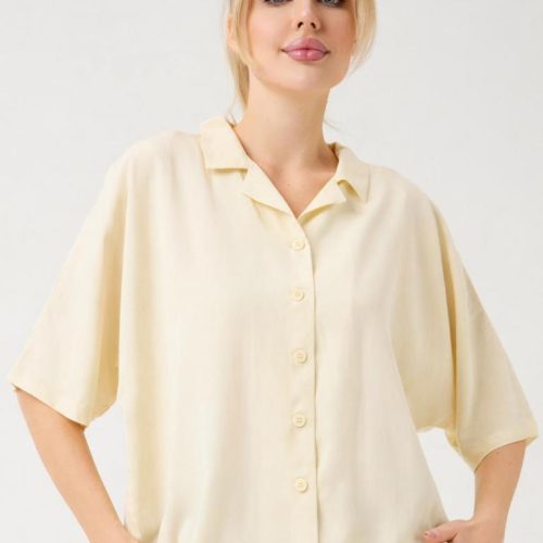 The soft open collar and clean button-front give the blouse a modern, versatile appeal, while the lightweight fabric delivers a subtle natural sheen and a cooling touch on the skin. Designed to move beautifully, it pairs seamlessly with matching trousers or worn loosely over swimwear for an elevated vacation look.