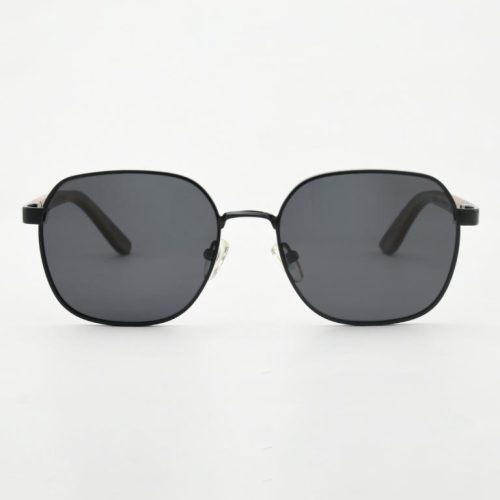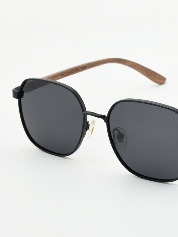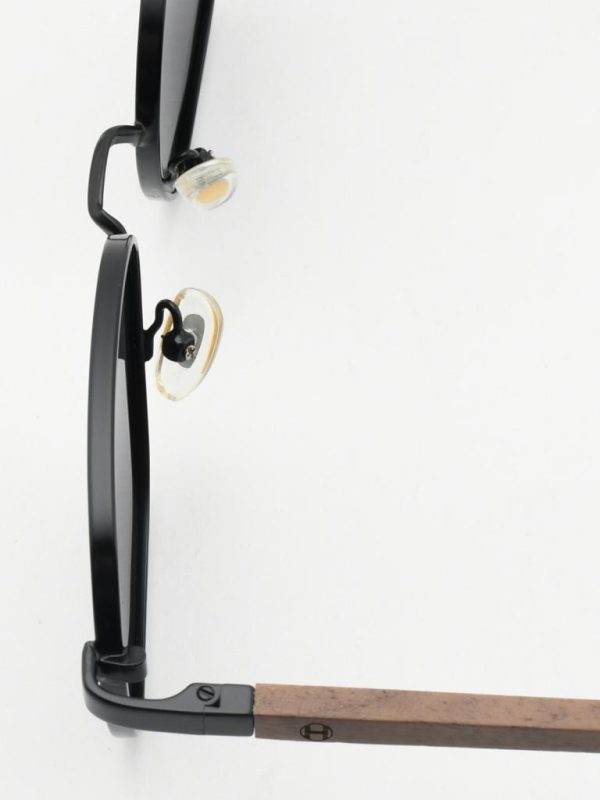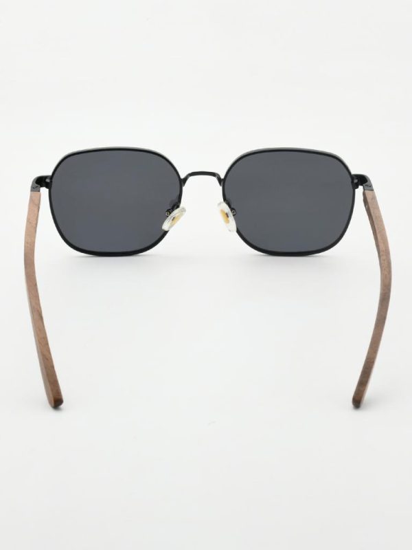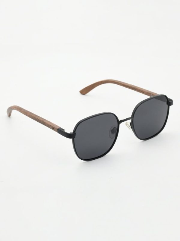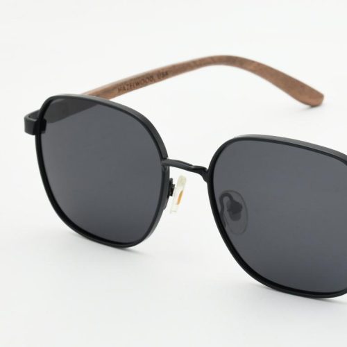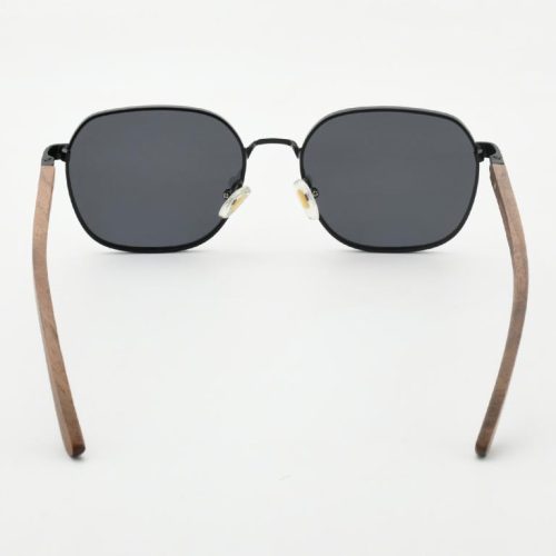 A lightweight metal–PC hybrid front in matte black meets warm walnut-wood temples. The rounded-square (panto) shape is timeless, while 1.1 mm gray polarized lenses keep vision crisp and glare-free. Spring hinges and adjustable nose pads deliver all-day comfort.