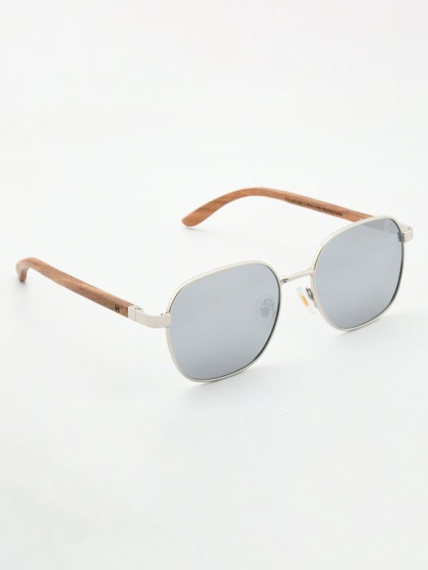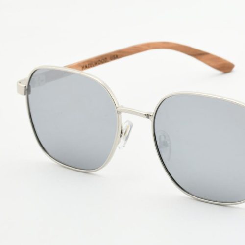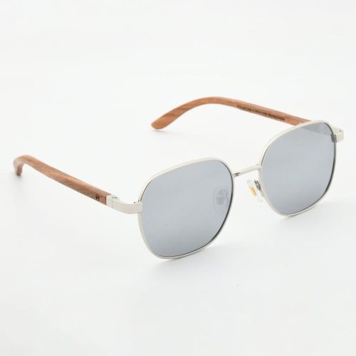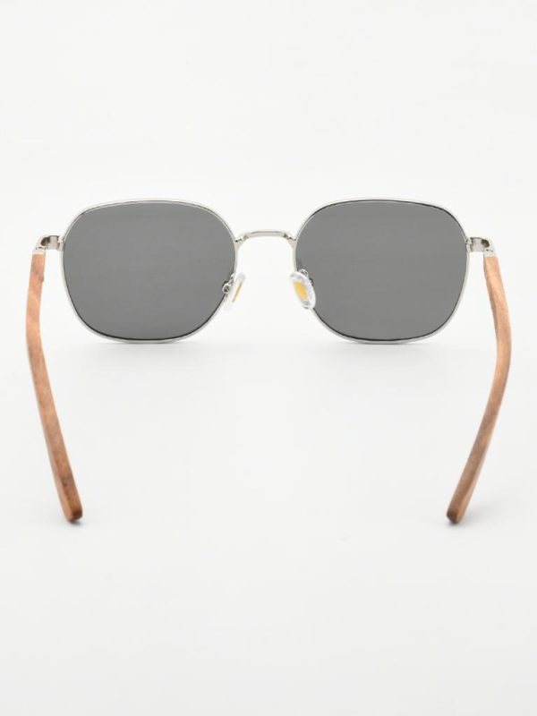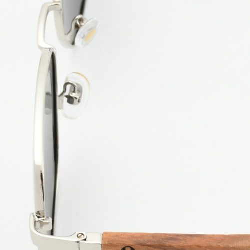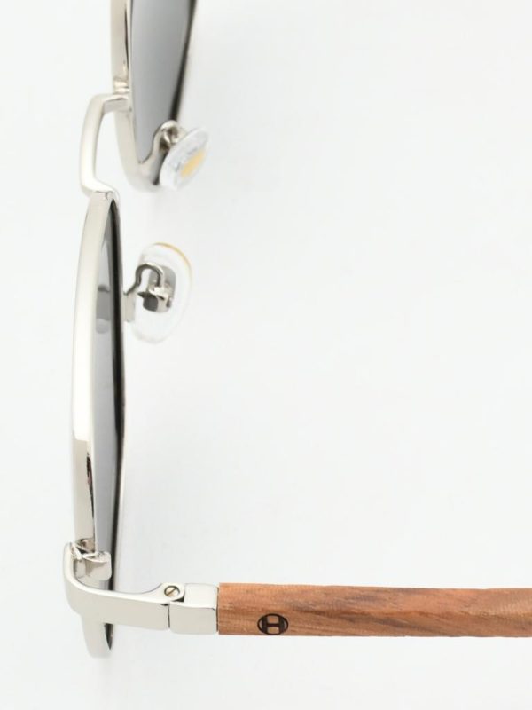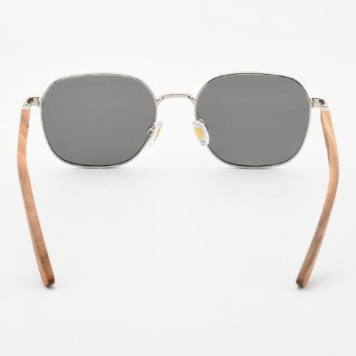 A sleek silver PC-metal front and warm walnut-wood temples. 1.1 mm gray polarized lenses cut glare for crisp, comfortable vision. Spring hinges and adjustable nose pads keep the fit easy all day.