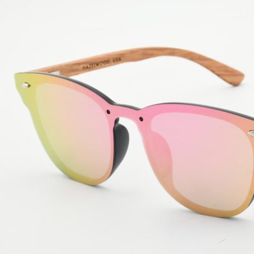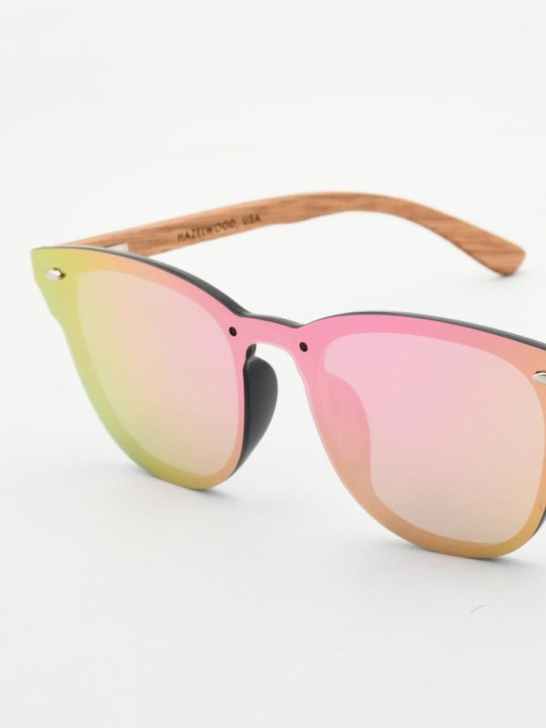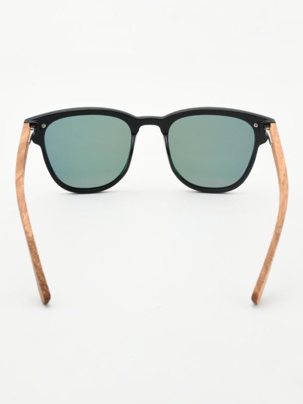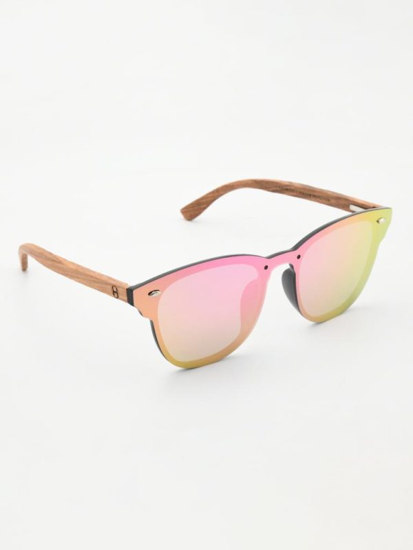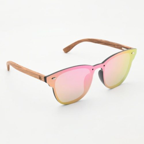 one-piece mirror lens meets a matte black PC browline and real zebra-wood temples. The shield-style front shifts green with pink-gold reflections, giving modern, beach-to-city energy with comfortable spring-hinge flex.