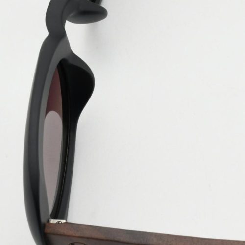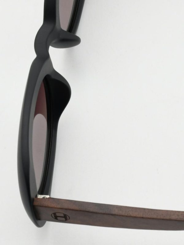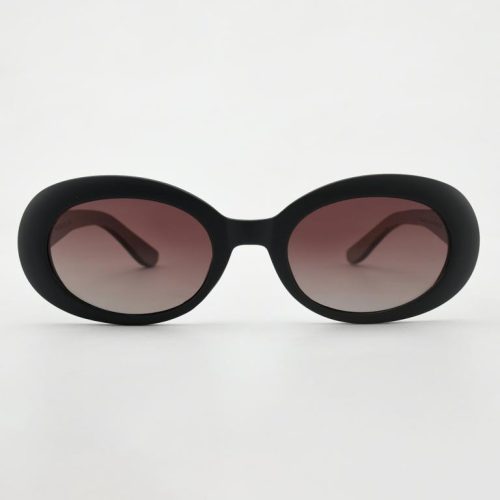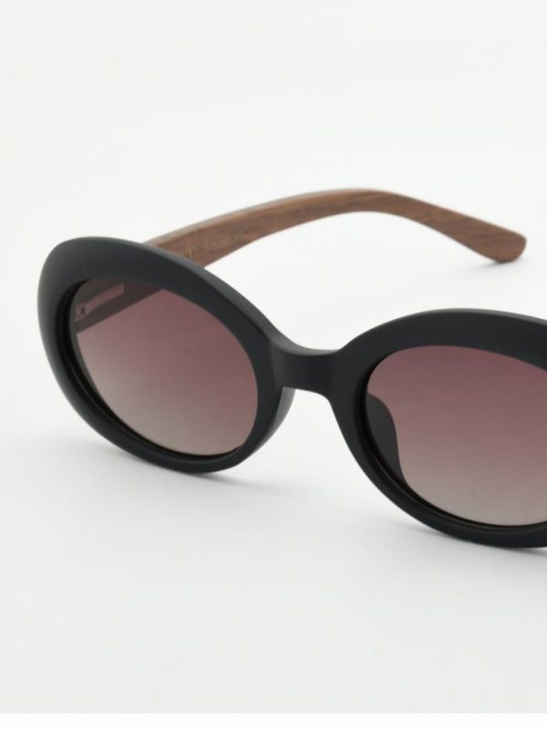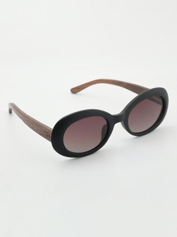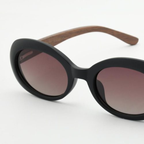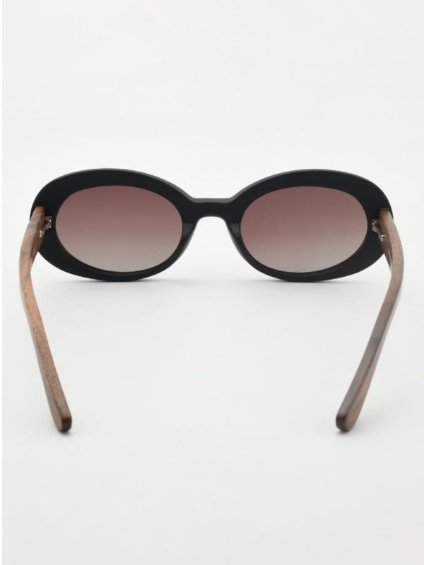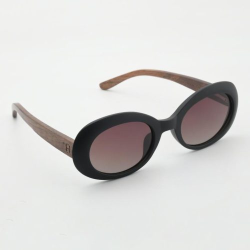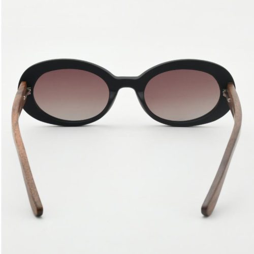 Soft, romantic ovals with a modern matte-black front and warm walnut-wood temples. The gradient-brown 1.1 mm polarized lenses soften light and cut glare for flattering, comfortable vision. Lightweight, feminine, and gift-ready.