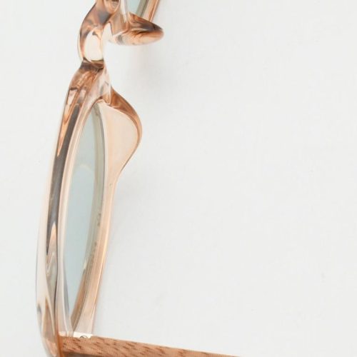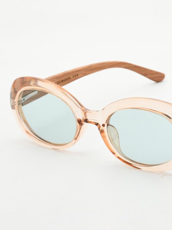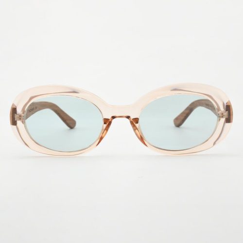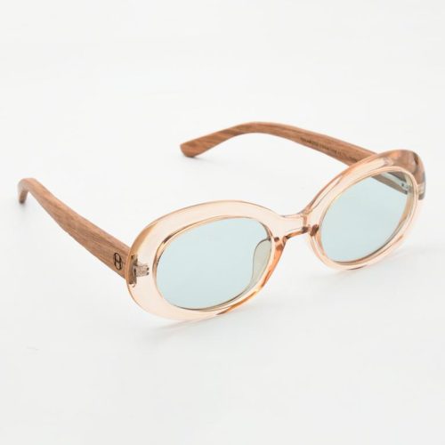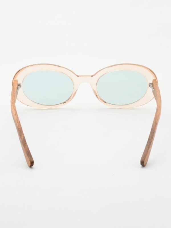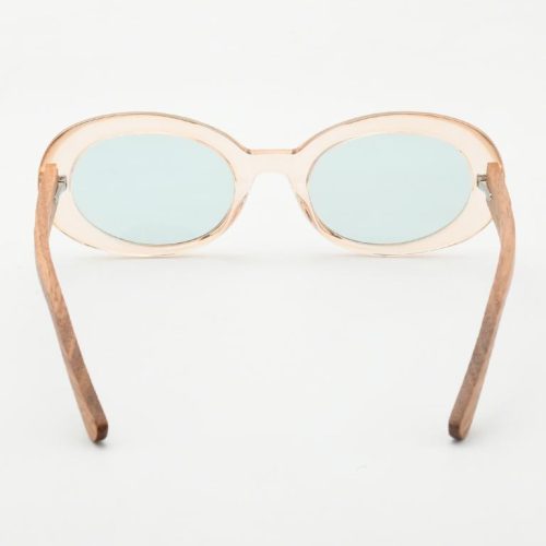 Romantic oval shape—now in a luminous crystal-peach front with warm walnut-wood temples. Light-aqua polarized 1.1 mm lenses add a fresh, dreamy glow while cutting glare and protecting your eyes. Feminine, airy, and gift-ready.